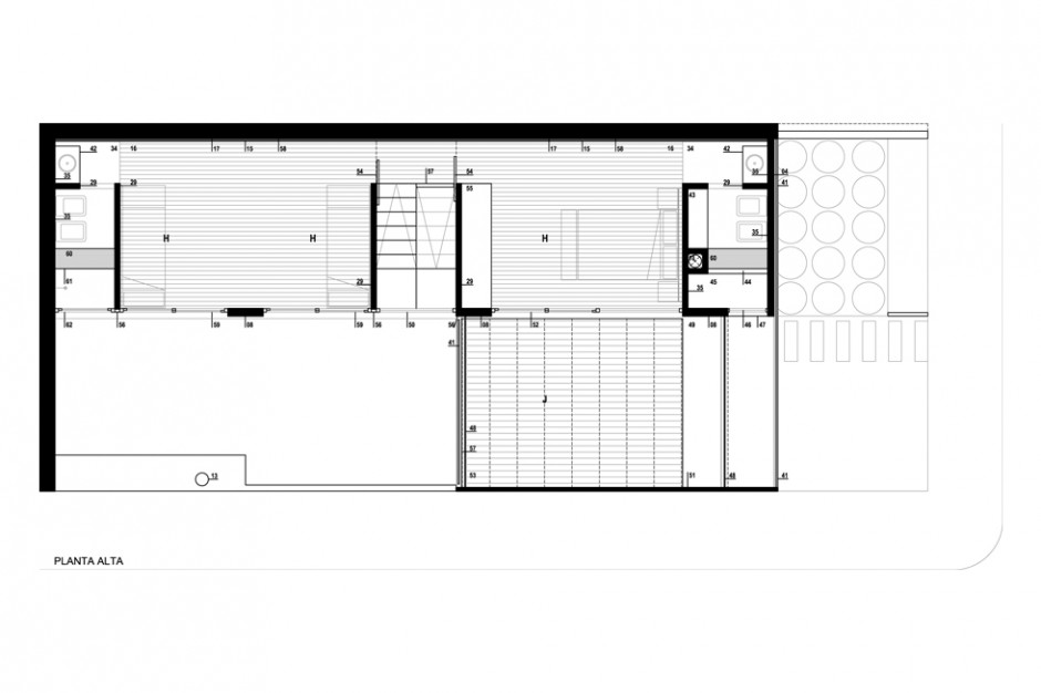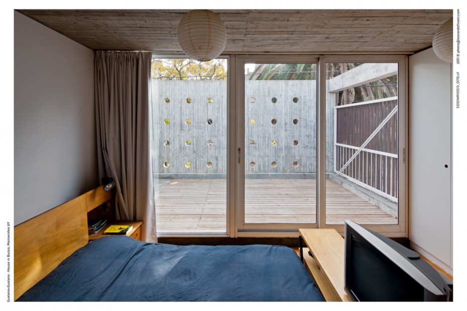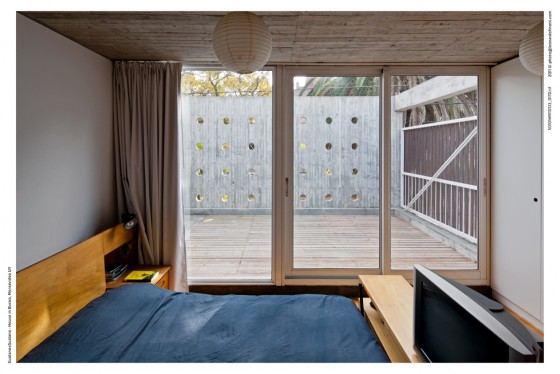 El dormitorio principal tiene su propio espacio exterior, que es una terraza/patio que cuelga sobre el patio de abajo por un sistema de tensores, de esta forma la planta alta cuando cruza al límite blando se transforma en esta terraza, reforzando la idea del manejo de las dos bandas, un patio colgando sobre el otro.