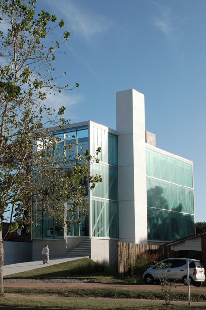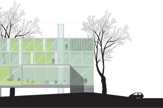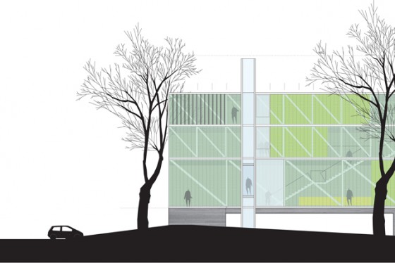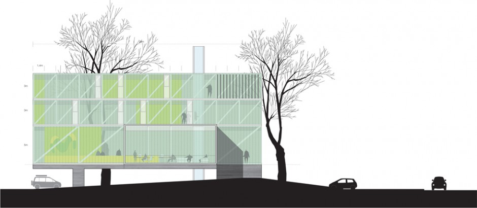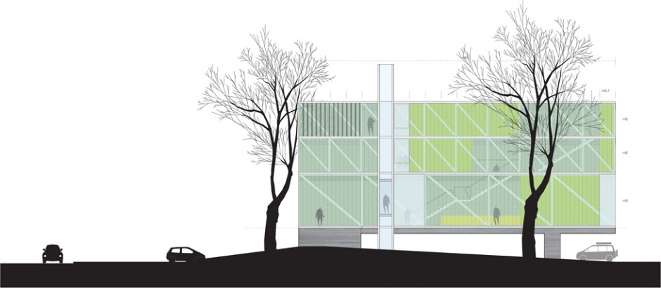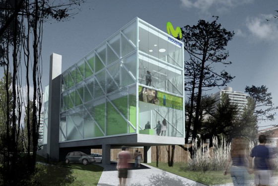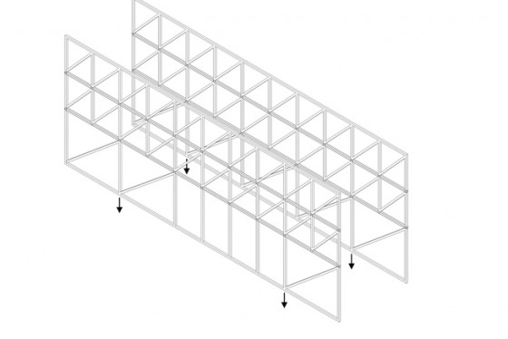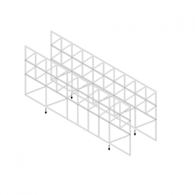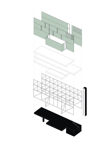 El proyecto se genera a partir del sistema estructural, donde una estructura reticulada metálica, sostiene al edificio- que se apoya en 2 puntos (atrás y adelante) a modo de puente-, salvando una luz de más de 20m.