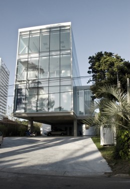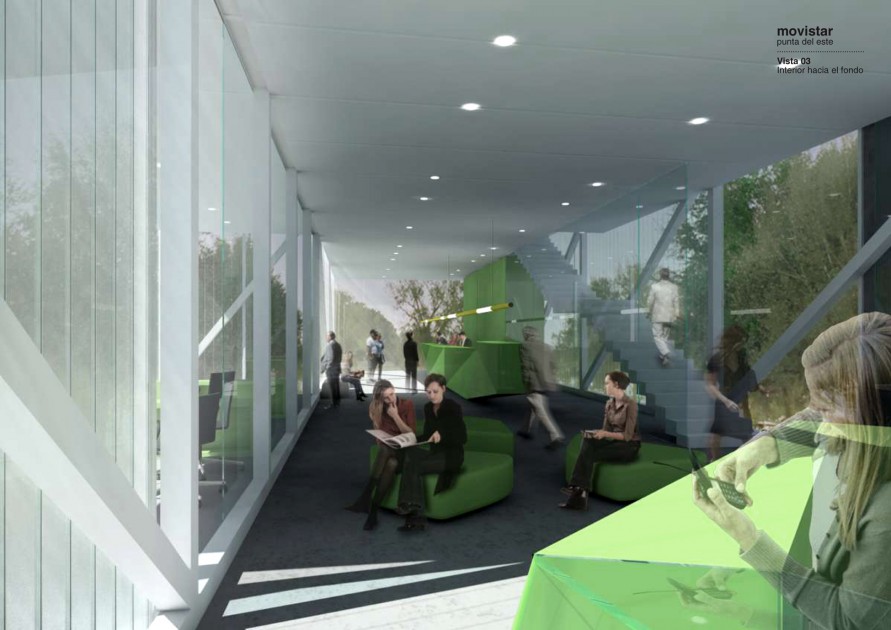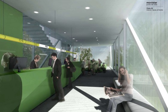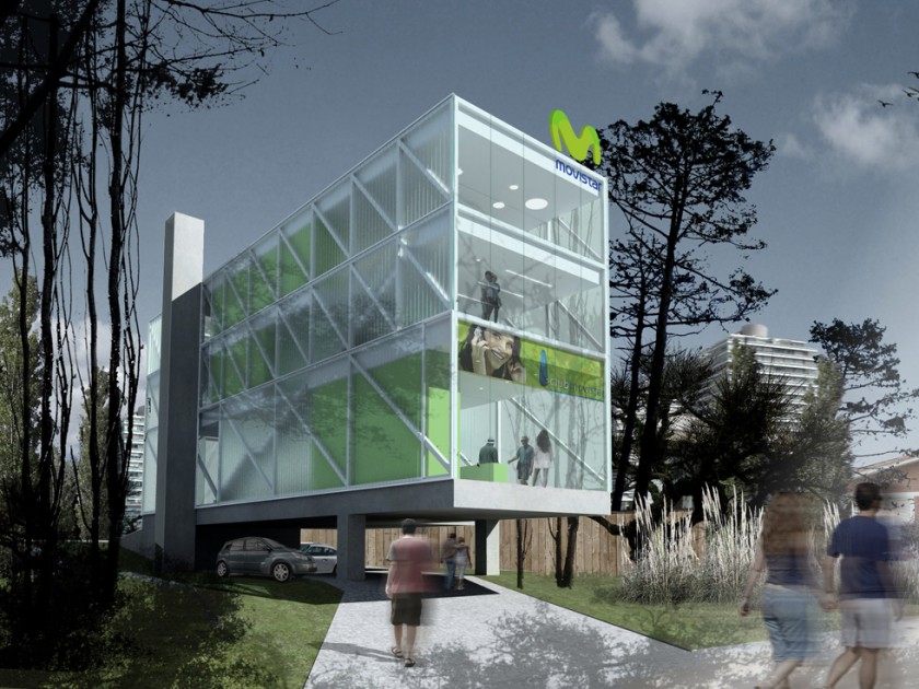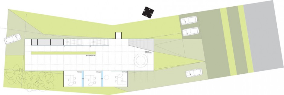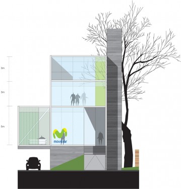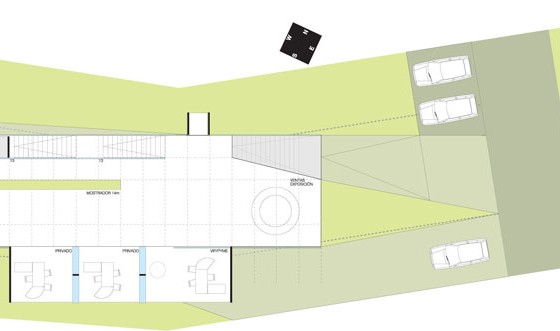 El edificio se sobreeleva, generando debajo el estacionamiento, un primer nivel de atención al público, un segundo nivel de oficinas y sus servicios asociados y un último y tercer nivel donde se ubica el showroom y una terraza al exterior.