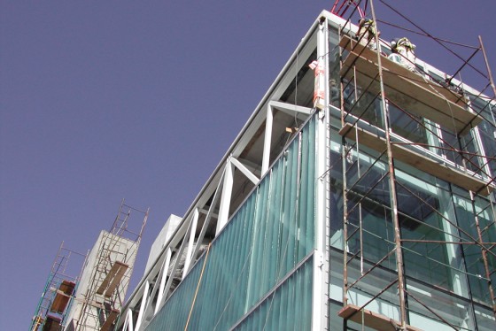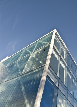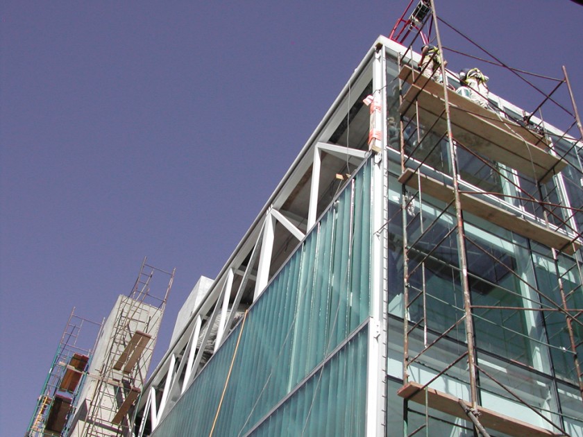 Un revestimiento de u-glass (perfil de vidrio colado) conforma la membrana externa. Un material que nos ofrecía un grado de transparencia controlada y nos permitía generar un edificio luminoso y extraño.