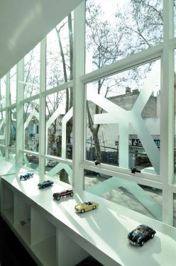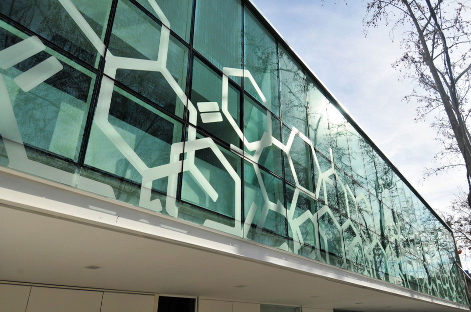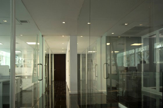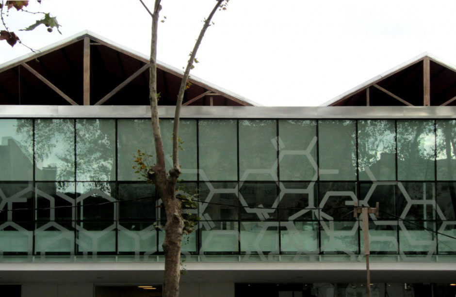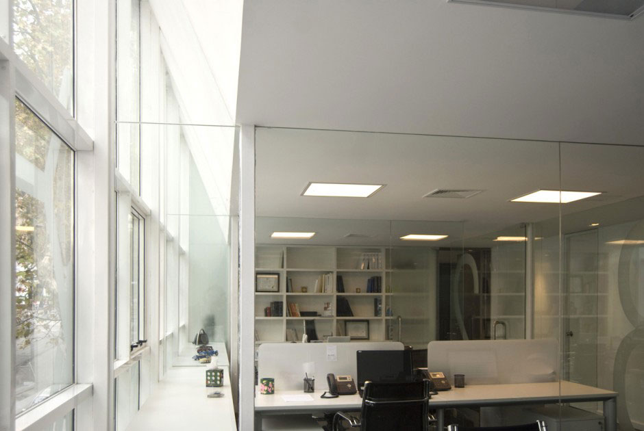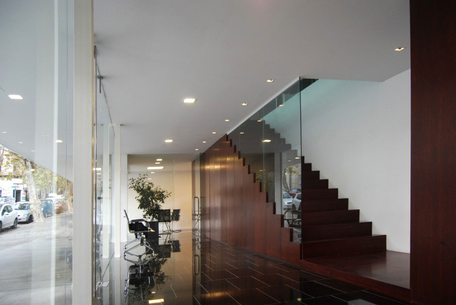 La nueva imagen planteada para el laboratorio desde la arquitectura, ofrece un edificio transparente, que comparte las copas de los árboles de la calle, los integra a su paisaje interior. Una pieza que desde la transparencia intenta incorporar la luz hasta el fondo del edificio de planta alta, consiguiendo a través de un patio posterior una segunda entrada de luz, una captura desde dentro, del cielo por debajo del techo preexistente, donde un pilar enramado se transforma en el personaje del patio.