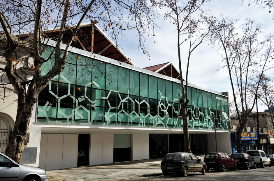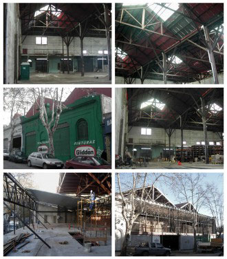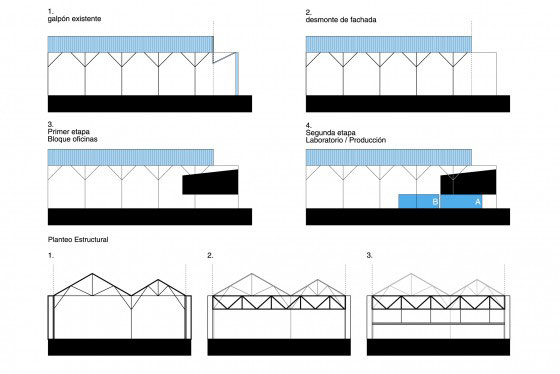 El proyecto es un inserto bajo el techo preexistente, generando una nueva fachada hacia la calle, donde la intervención se separa y se diferencia del galpón antiguo.