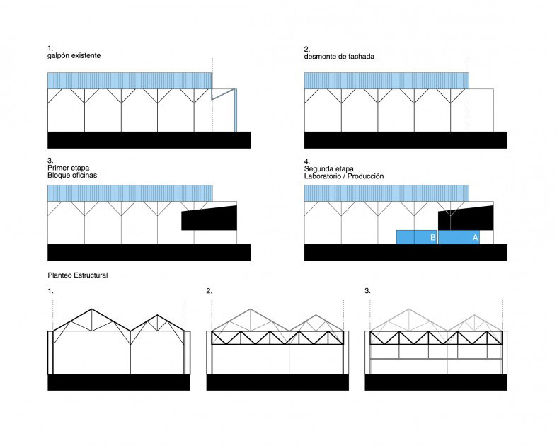 Un nuevo edificio se levanta del piso, deja entrar al viejo galpón y genera la nueva identidad del laboratorio.