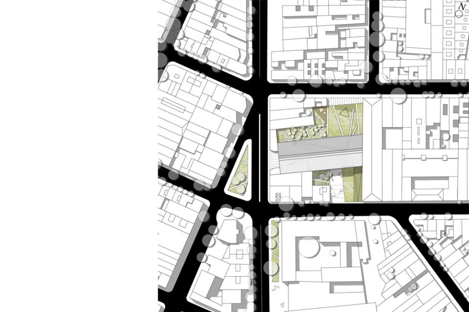 La plaza discurre bajo el techo y se escapa hacia las calles laterales, donde captura las geometrías y fugas que las construcciones existentes nos ofrecen, el parcelario define la oportunidad, y cada rincón ofrece posibilidades de uso.
