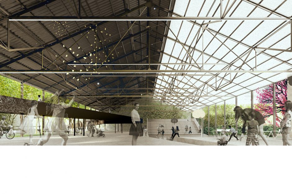 El Techo a dos aguas del viejo galpón se cubre hacia el norte con chapa opaca  y al sur con chapa traslúcida; obteniendo un espacio de sombra para actividades de estar y descanso y un espacio luminoso al sur donde se alojan las actividades de carácter deportivo.